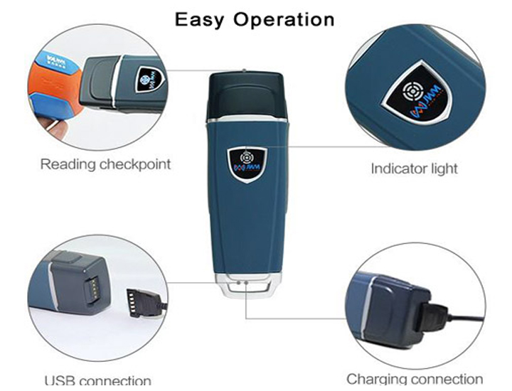 It can scan the checkpoints info within 5cm. The G4S is using this one. WM-5000V5 works with RFID tags. It is with pogo pin connector instead of the normal USB port, which makes thedevice more durable and waterproof. This kind product is one of the most popular products in our customers.